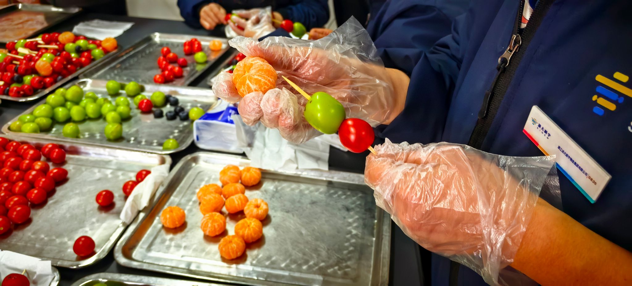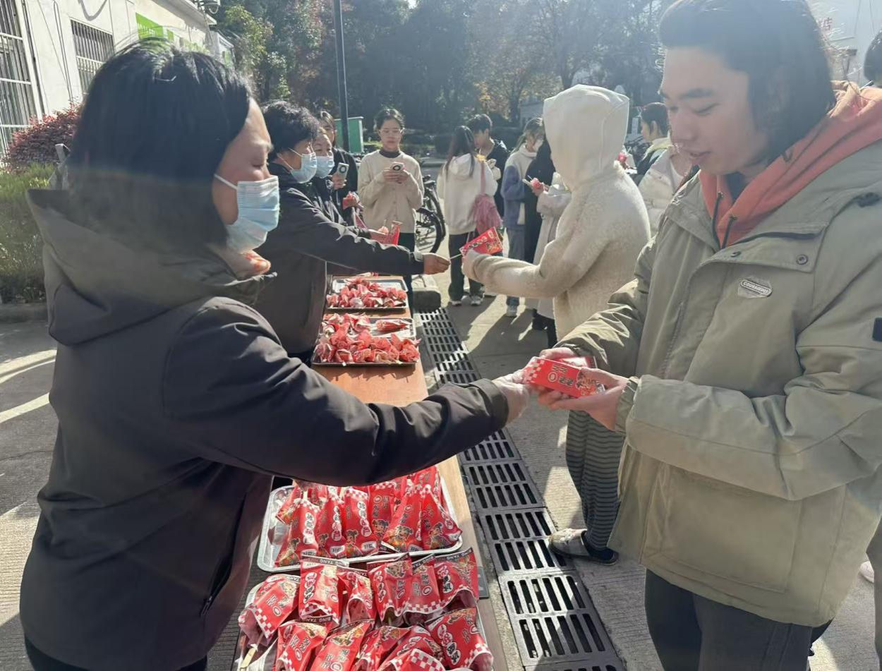 活动当天,中苑10号站前早早挂起了主题鲜明的红色横幅。从清晨开始,宿管阿姨们便忙碌起来,精心筛选、清洗每一颗山楂,亲手串制、熬糖、裹上特制的浓郁奶皮。这份全手工制作的匠心,不仅是对传统冰糖葫芦制作技艺的传承,更是一堂生动的“生活劳动教育课”。同学们在下课途中惊喜地领取到这份冬日限定礼物,酸甜可口的山楂裹着绵密奶香,瞬间驱散了寒意,脸上洋溢着幸福的笑容。
