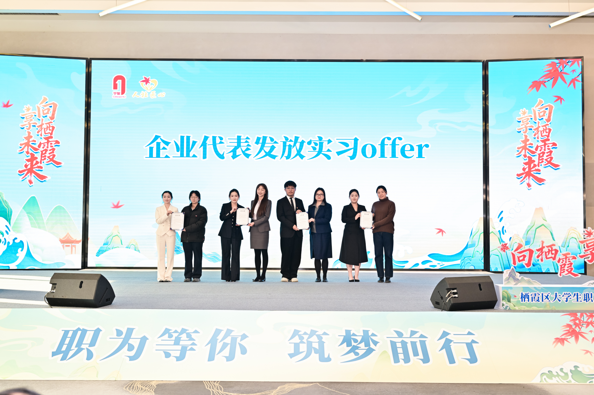为落实高校毕业生就业创业工作部署,践行新时代人才强国战略,助力大学生留宁留栖发展,12月16日,由南京市栖霞区人社局主办的“向栖霞·享未来”栖霞大学生职业规划大赛高教组评选圆满结束。我校金融学院金融2304班鲍宇杰同学获二等奖第一名、营销与物流管理学院广告2201班刘姝均同学获优胜奖第一名。鲍宇杰同学在颁奖典礼上进行风采展示,并获得驻区企业发放的实习offer。