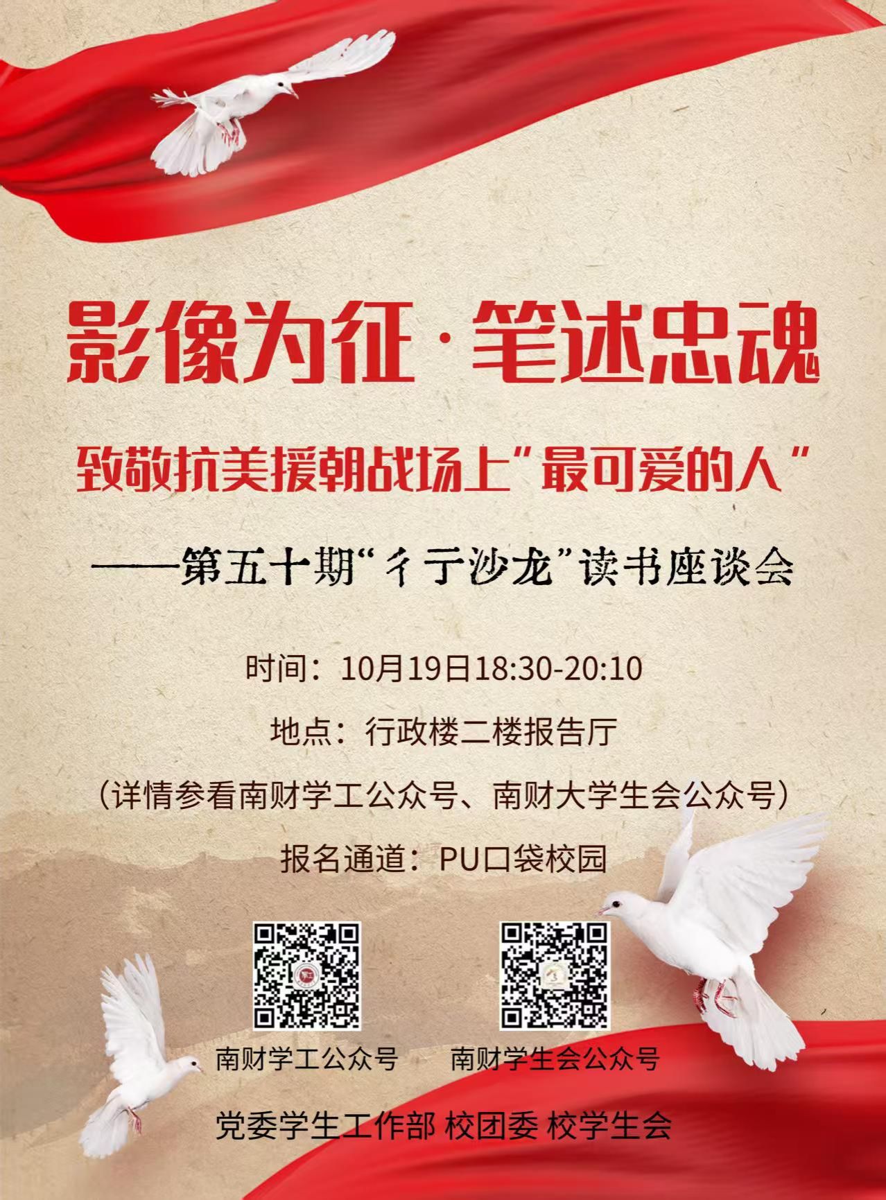 内容简述:七十五载前烽火燃,保家卫国正义彰。忆往昔,英雄儿女跨过鸭绿江,在枪林弹雨中坚守阵地,在零下四十度的严寒里铸就丰碑。中华人民共和国成立以来,无数英烈用生命和热血捍卫国家尊严与和平。在此背景下,本次“彳亍沙龙”以“影像为征·笔述忠魂——致敬抗美援朝战场上‘最可爱的人’”为主题开展读书交流活动,聚焦《决战朝鲜》与《跨过鸭绿江,抗美援朝影像记忆》两本著作,引领南财学子重温那段血与火的光辉岁月,深入理解抗美援朝作为立国之战的血性与悲壮,感悟其如何重塑中国国际地位;通过珍贵历史图片与真实叙事,全景式体会抗美援朝战争的真实面貌,感受全国军民众志成城的伟大力量。激励南财青年赓续红色基因,坚定理想信念,传承抗美援朝精神中蕴含的爱国主义、英雄主义与斗争精神,将青春热血融入民族复兴的伟大征程,续写南财人的时代华章。