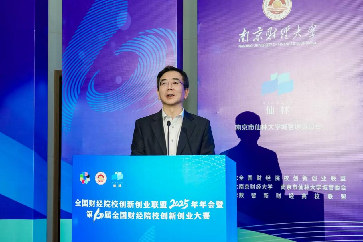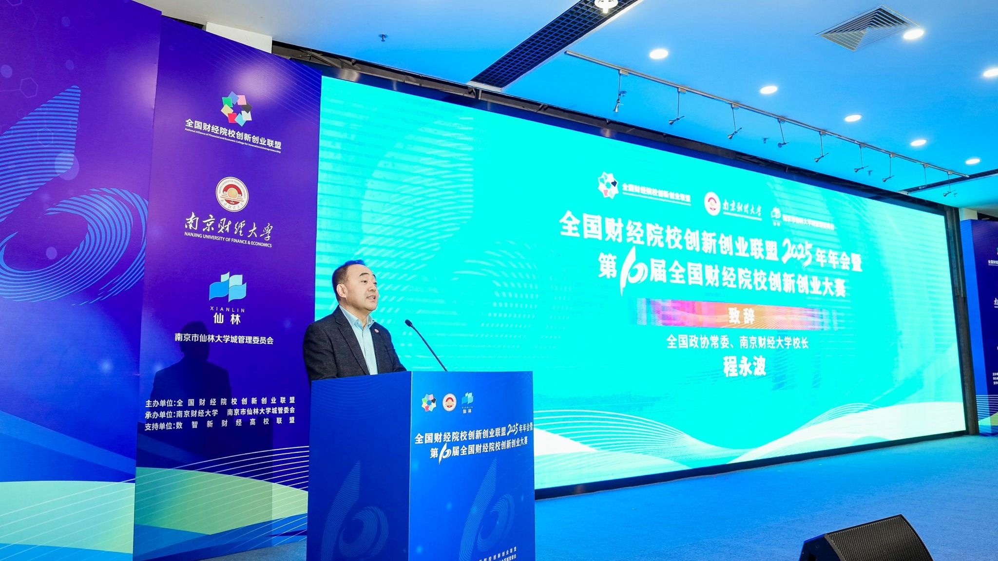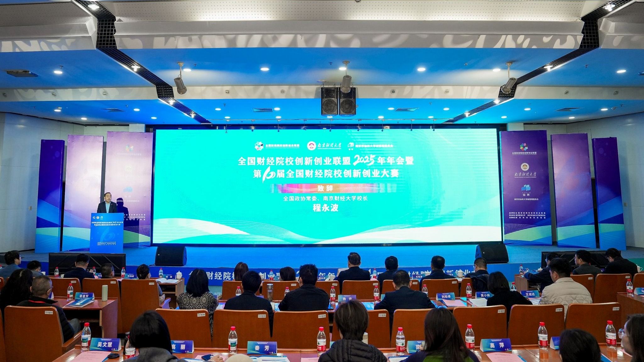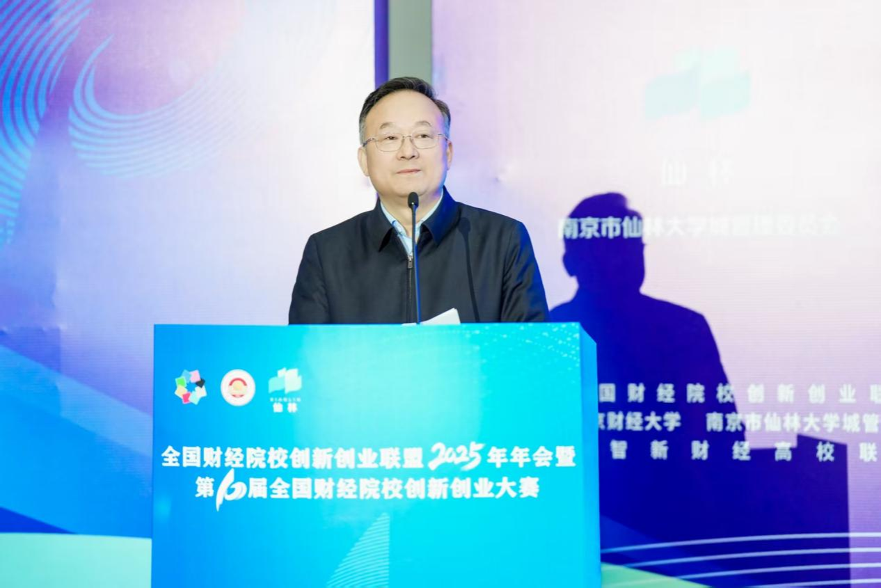 11月28日,全国财经院校创新创业联盟2025年年会暨第十届全国财经院校创新创业大赛决赛在我校仙林校区举办。江苏省教育厅副厅长、党组成员杨树兵,南京市栖霞区人民政府区长、南京经济技术开发区管委会主任、仙林大学城管委会主任王承江,栖霞区人民政府副区长朱翰墨,全国政协常委、我校校长程永波,上海财经大学党委常委、副校长姚玲珍,内蒙古财经大学党委常委、副校长赵国年,东北财经大学党委常委、副校长施锦芳,吉林财经大学党委常委、副校长杨楠,江西财经大学党委常委、副校长贺丹君,西南财经大学党委副书记明海峰,浙江财经大学党委常委、副校长董进才,栖霞区政府办、科技局、人才工作局、高校发展局相关负责人,来自中央财经大学、上海财经大学等46所高校的350余名师生参加会议和决赛。开幕式由我校党委常委、副校长刘衍民主持。