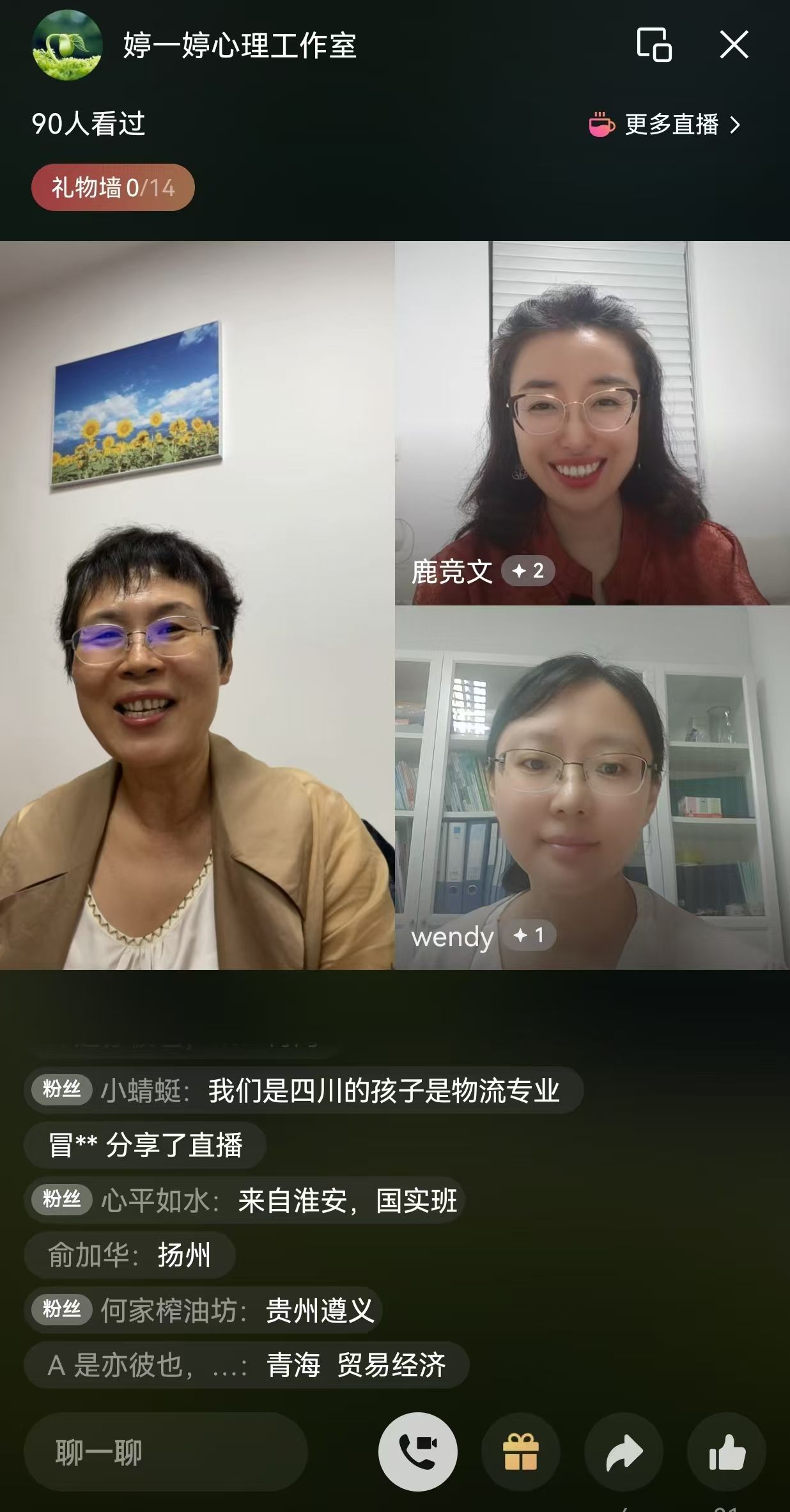 直播沙龙在温馨专业的氛围中拉开帷幕。高剑婷老师首先代表中心对广大新生家长的参与表示欢迎,并简要介绍了大学生常见心理适应问题及家庭支持的重要性。随后,鹿竞文副教授结合其中医学与心理学交叉背景,从“身心一体”的角度出发,为家长讲解了如何通过情绪觉察、沟通调适等方式,帮助孩子平稳过渡大学新生活。她强调,家长的理解与陪伴是学生建立安全感、归属感的重要基础。